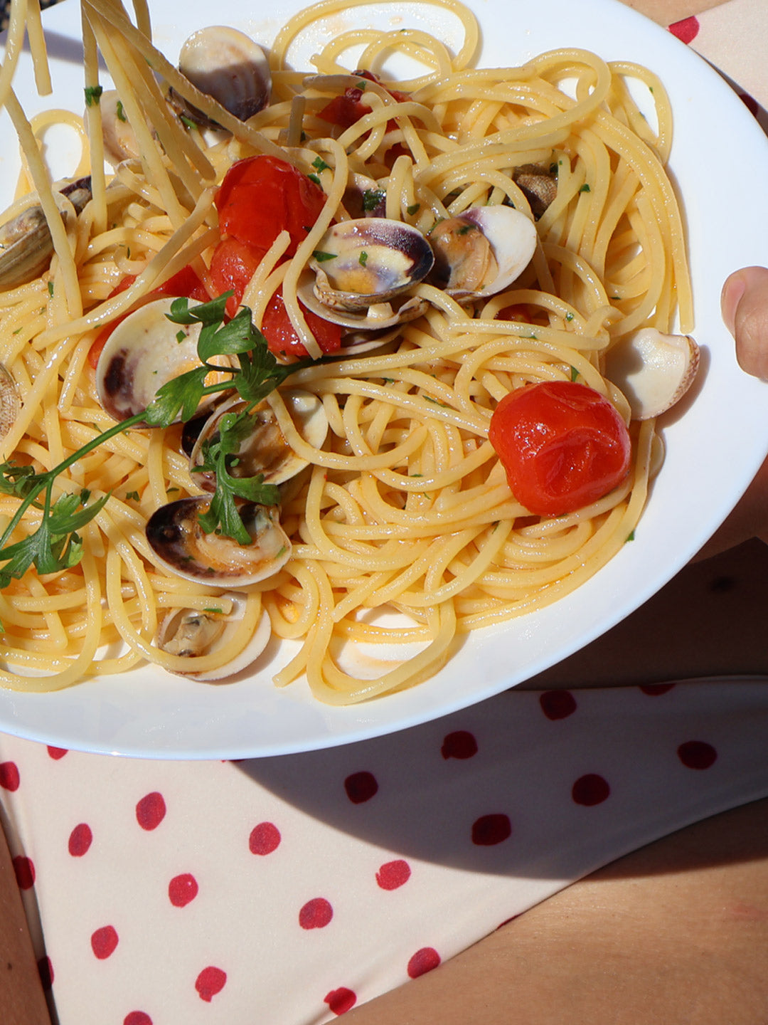 Right now, I’m in my hometown of Lenola in Lazio, Latina. The region is famous for all things buffalo milk. In summer, I eat fresh mozzarella di bufala like apples. Other cravings: Schiacciata or pizza rossa, sun-warmed summer tomatoes, local cimi di rape (a type of Italian kale), spaghetti alle vongole, bistecca with a squeeze of lemon, and pizza di bieta — a regional speciality that’s a fried chard pie soaked in garlic vinegar. Snails in tomato sugo, too. And always, two gelati a day from Pupo in Terracina.