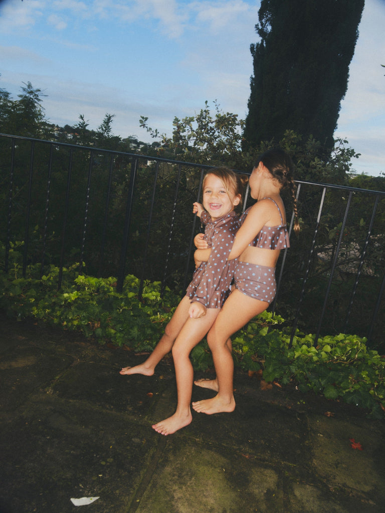 An asymmetrical shoulder two-piece swimsuit. Crafted from eco cloud Lycra and finished with charming ruffle details.