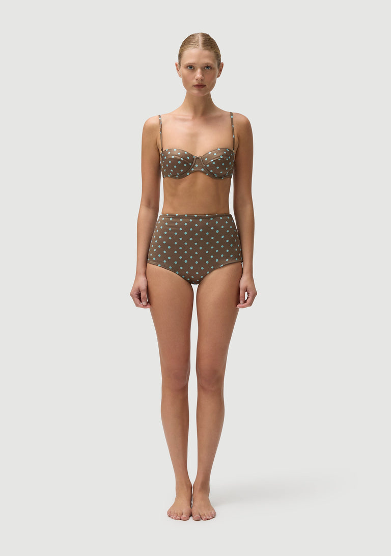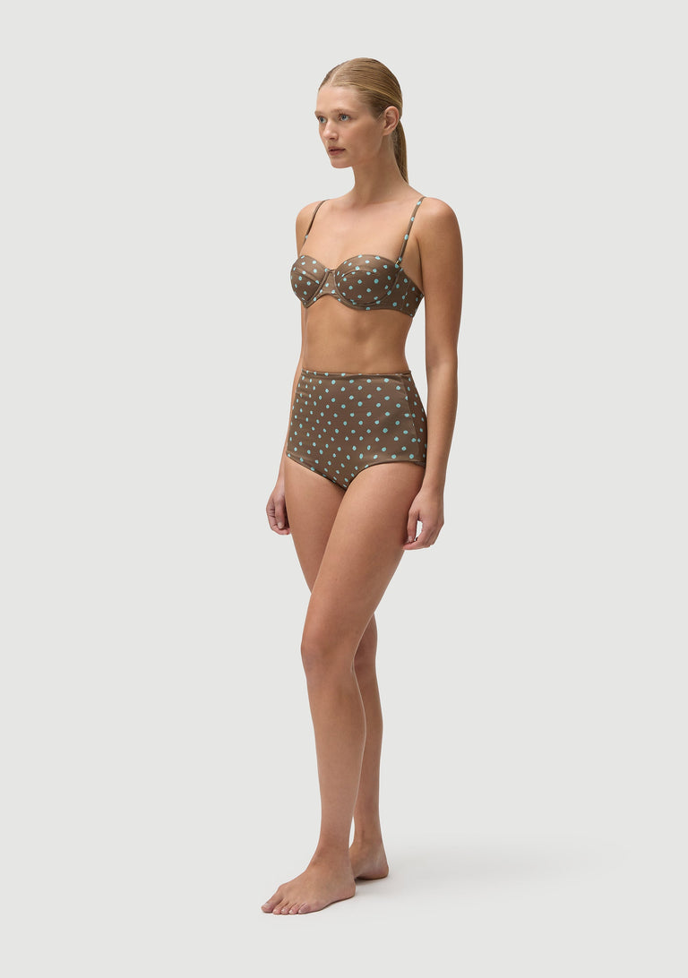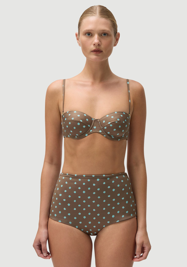 An underwired bra style top with light padding.  Best suited for B cup (size S) and larger.  Medium coverage, extremely supportive.  Fully lined.