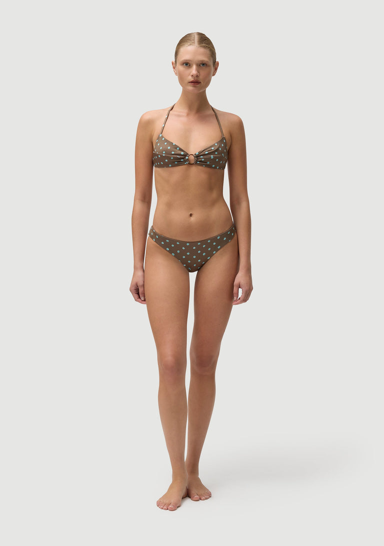 70s butterfly halter with an Italian plexiglass ring.  Best suited for bust cups A B and C. (size XS to M).  Small to medium coverage.  Fully lined.