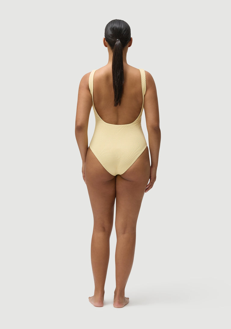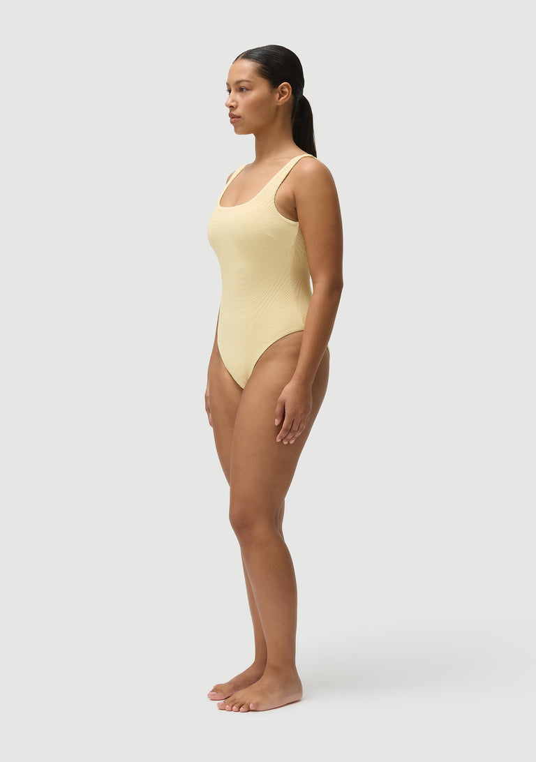 A classic square neck, body contouring one-piece.  Waist level scoop back.